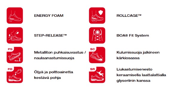 Nämä turvajalkineet on suunniteltu ammattilaisille, jotka vaativat jalkineiltaan keveyttä, joustavuutta ja luotettavaa suojaa. Kantapään ENERGY FOAM -pehmusterakenne lisää käyttömukavuutta ja tekee jalkineista joustavat pitkissä työvuoroissa. STEP-RELEASE™-kanta helpottaa ja nopeuttaa kengän riisumista, mikä on hyödyllistä erityisesti tilanteissa, joissa jalkineita vaihdetaan usein päivän aikana.